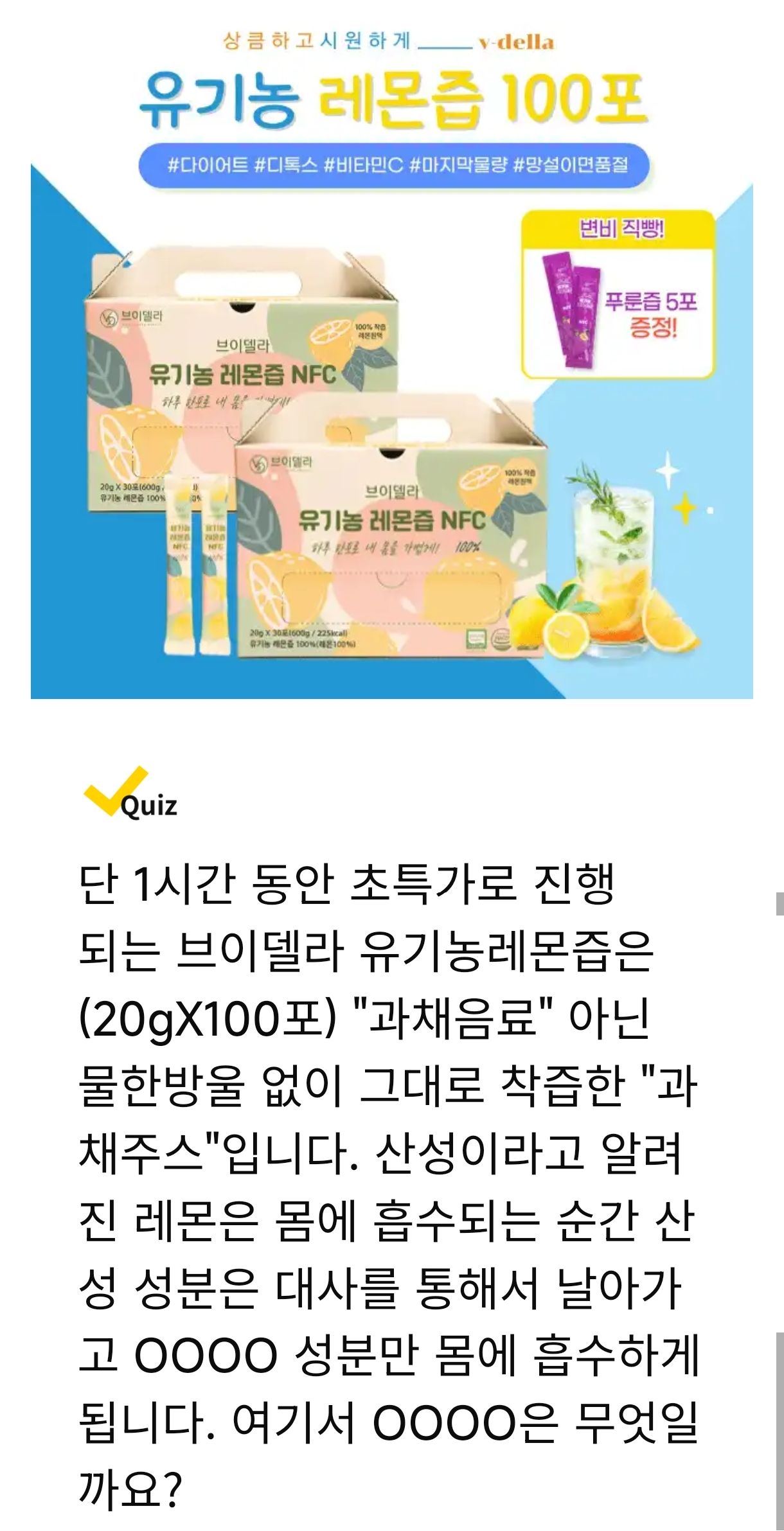 [대용량]100포 브이델라 유기농 레몬즙 20g