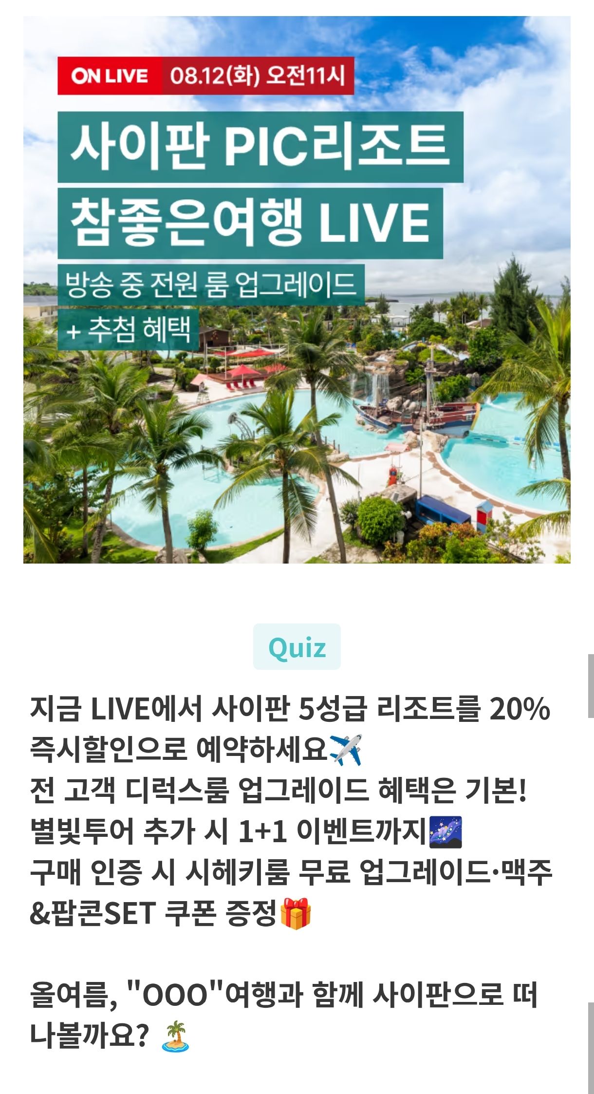 지금 LIVE에서 사이판 5성급 리조트를 20% 즉시할인으로
