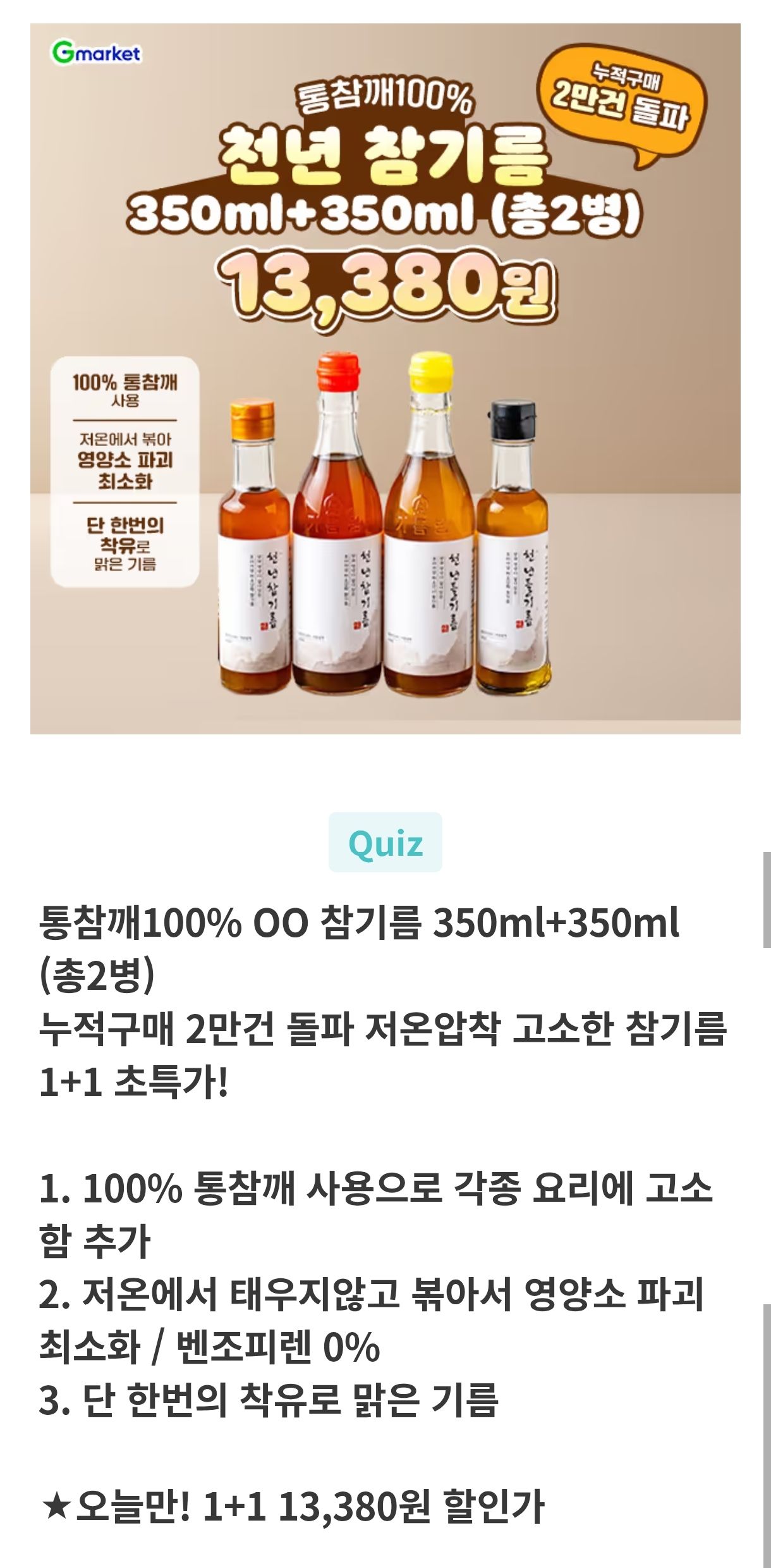 2만건 돌파 저온압착 고소한 참기름 1+1 초특가! 1. 100%