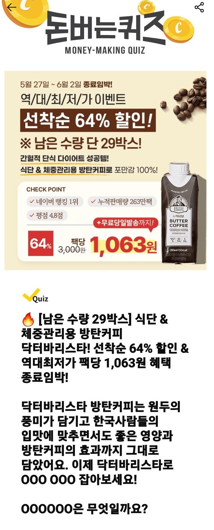 [남은 수량 단 29박스] 간헐적 단식 다이어트 성공템 닥터바리스타 방탄커피 선착순 64% 할인 & 팩당 1063원 혜택이 곧 종료됩니다. 닥터바리스타 방탄커피는 ㅇㅇㅇㅇ 줄이고 건강한 지방으로 채워 포만감을 가득 주면서도 건강한 식습관을 형성할 수 있도록 도와줍니다. 방탄커피 한잔으로 든든하게 다이어트 해보세요